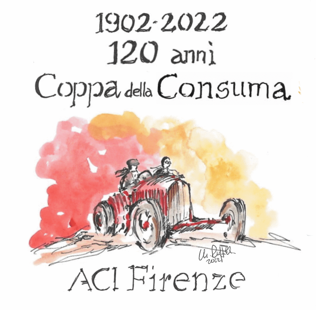 La locandina ufficiale per l’edizione 2022 vede il contributo grafico del Presidente di ACI Firenze, l’architettto Massimo Ruffilli, che ha realizzato un acquerello proprio per ricordare i 120 dalla prima edizione della Coppa della Consuma: era il 15 giugno del 1902. Non fu un inizio facile, e nella migliore tradizione polemica toscana, alla prima gara si registrò, puntuale, il primo reclamo: accadde infatti che il secondo classificato, Ugobaldo Tonietti su Panhard, contestò la vittoria del triciclo De Dion-Bouton di Nourry.