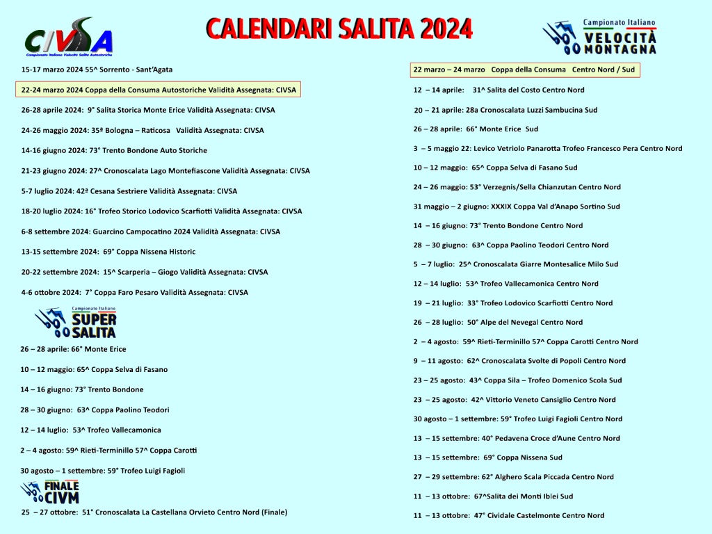 Il siciliano Salvatore (Totò) Riolo ha ottenuto il miglior tempo in assoluto alla Coppa della Consuma storica 2024 in 3’56″02 ed ha vinto il 4° Raggruppamento su PRC A 6 Bmw alla gara inaugurale del Campionato Italiano Velocità Salita Auto Storiche, mentre con il tempo di 3’19″44 Simone Faggioli su Nova Proto NP 01 ha conquistato la gara d’apertura stagionale del Campionato Italiano Velocità Montagna.