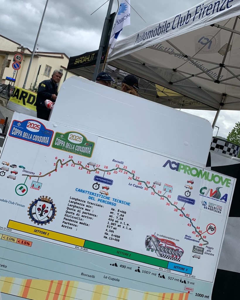 Svolte le due manche di ricognizione della Coppa della Consuma 2025, dalle 8.30 di domani domenica 27 aprile, la gara in salita unica sui 8.450 metri tra Diacceto e Poggio alla Ginestra, nei pressi del Passo della Consuma. Scatterà per prima la gara del Tricolore Auto Storiche, poi una sfilata di vetture dal particolare valore storico e sportivo ed a seguire la gara di CIVM.